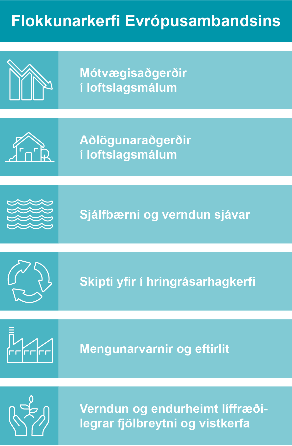 Flokkunarkerfinu er skipt í sex umhverfismarkmið. Þegar hafa verið birtar ítarlegar skilgreiningar á verkefnum sem falla undir fyrstu tvö markmiðin, en stefnt er að því að birta skilgreiningar á hinum fjórum flokkunum árið 2021. Flokkunarkerfið setur fram fjögur skilyrði sem atvinnustarfsemi þarf að uppfylla til að flokkast sem sjálfbær.