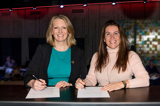 Lilja Björk Einarsdóttir, bankastjóri Landsbankans og Guðrún Björnsdóttir, framkvæmdastjóri Félagsstofnunar stúdenta, undirrituðu samninginn.