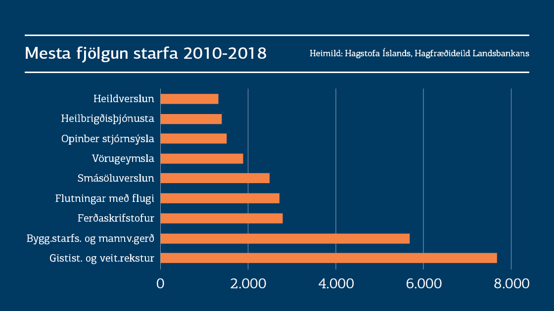 Starfsfólki á vinnumarkaði hér á landi fjölgaði um rúm 40 þúsund frá 2010-2018. Sé litið á þær greinar þar sem fjölgun starfsfólks var mest kemur ekki á óvart að margar þeirra tengjast ferðaþjónustu sem skapaði fjögur af hverjum tíu störfum sem urðu til á þessum 8 árum.