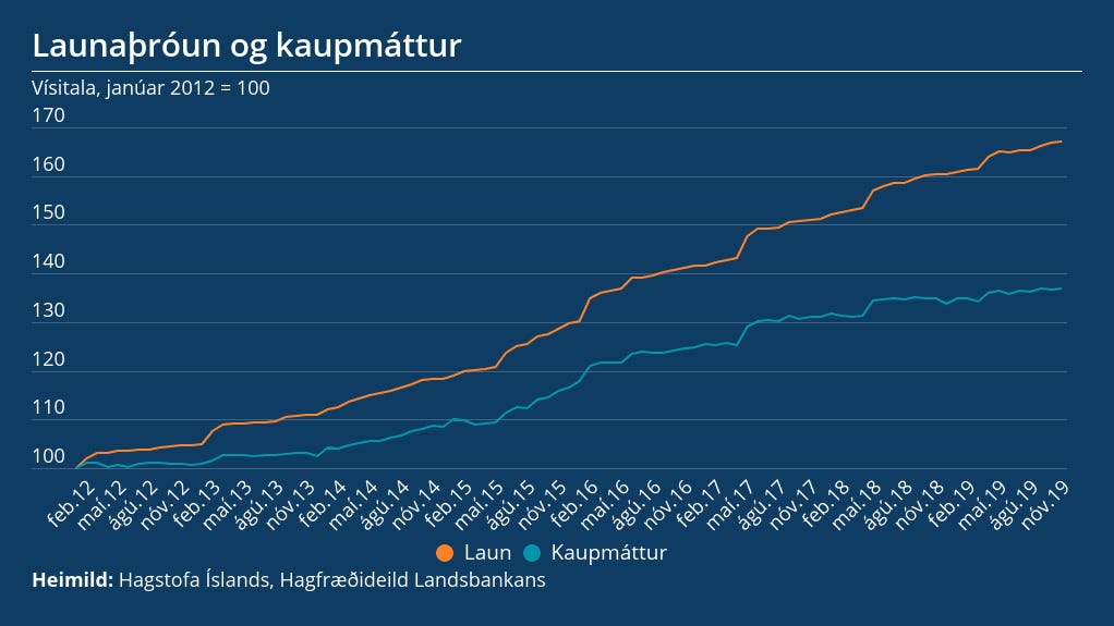 Þrátt fyrir að hækkunartaktur launa hafi lækkað nokkuð stöðugt hefur kaupmáttur launa aukist mikið og var t.d. rúmlega 17% meiri nú í nóvember en í árslok 2015. Kaupmáttur hefur aukist áfram á þessu ári og var 1,5% meiri í nóvember en í nóvember í fyrra.