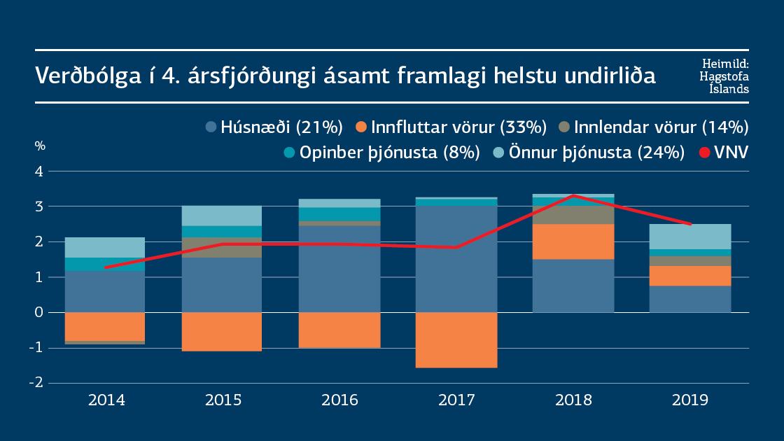 Verðbólga hefur verið nokkuð lág og stöðug síðustu ár, a.m.k. á íslenskan mælikvarða. Samsetning verðbólgunnar hefur þó tekið talsverðum breytingum á tímabilinu.