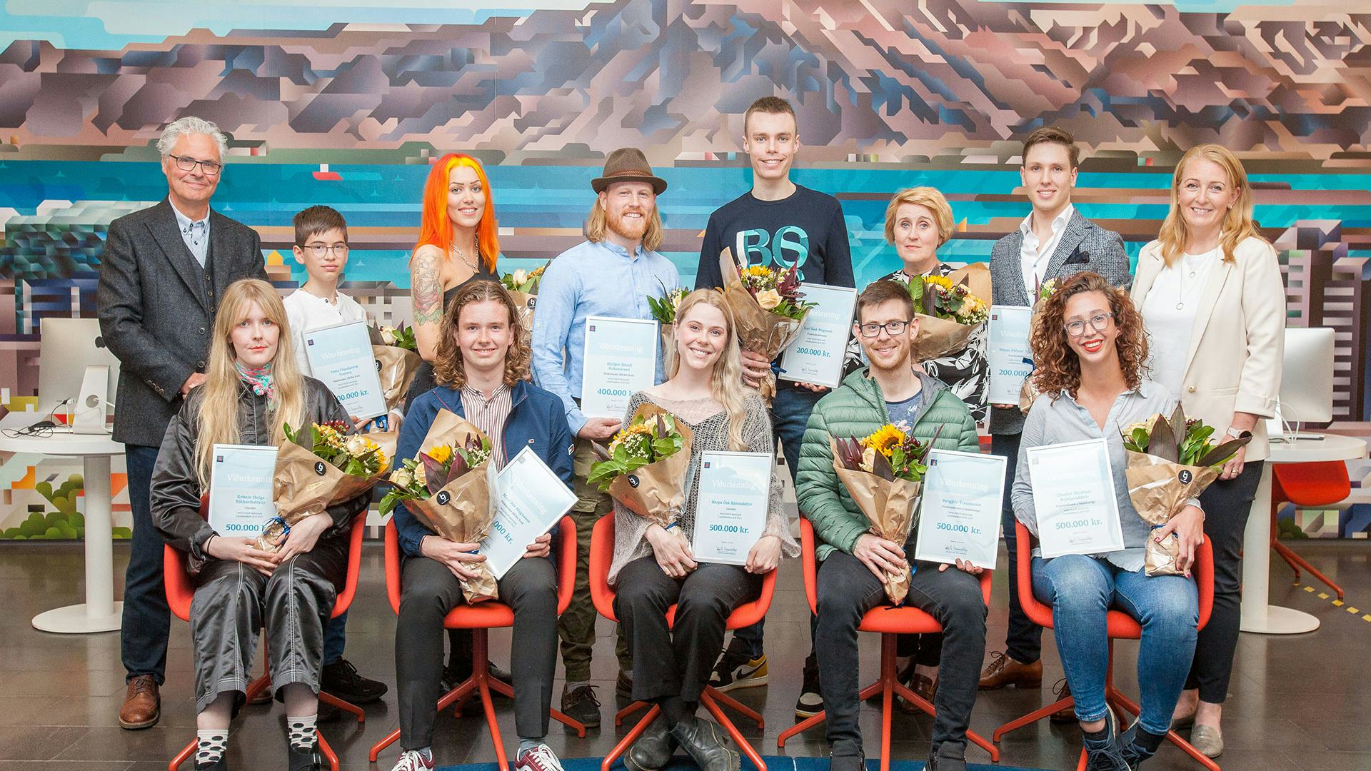 Á myndinni hér að ofan má sjá styrkþega eða fulltrúa þeirra sem tóku við styrkjunum ásamt Runólfi Smára Steinþórssyni, formanni dómnefndar og Lilju Björk Einarsdóttur, bankastjóra Landsbankans.
