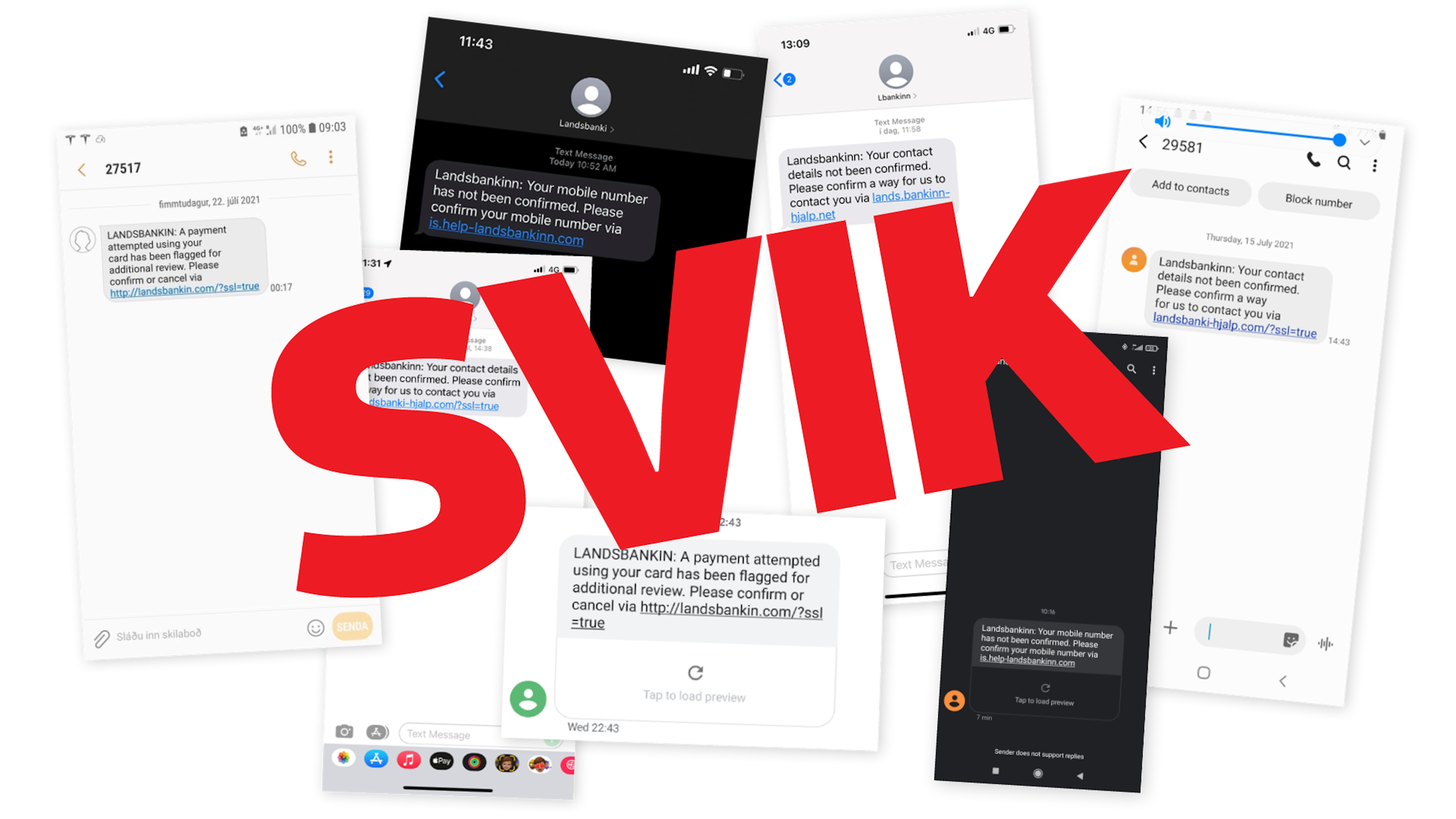 Landsbankinn sendir aldrei SMS-skilaboð eða tölvupóst með hlekk yfir á innskráningarsíðu netbankans/appsins. Til að fara inn í netbankann eða appið skaltu fara inn á vef bankans eða opna appið eftir venjulegum leiðum og skrá þig inn þar – en alls ekki smella á hlekki sem þú færð í skilaboðum.