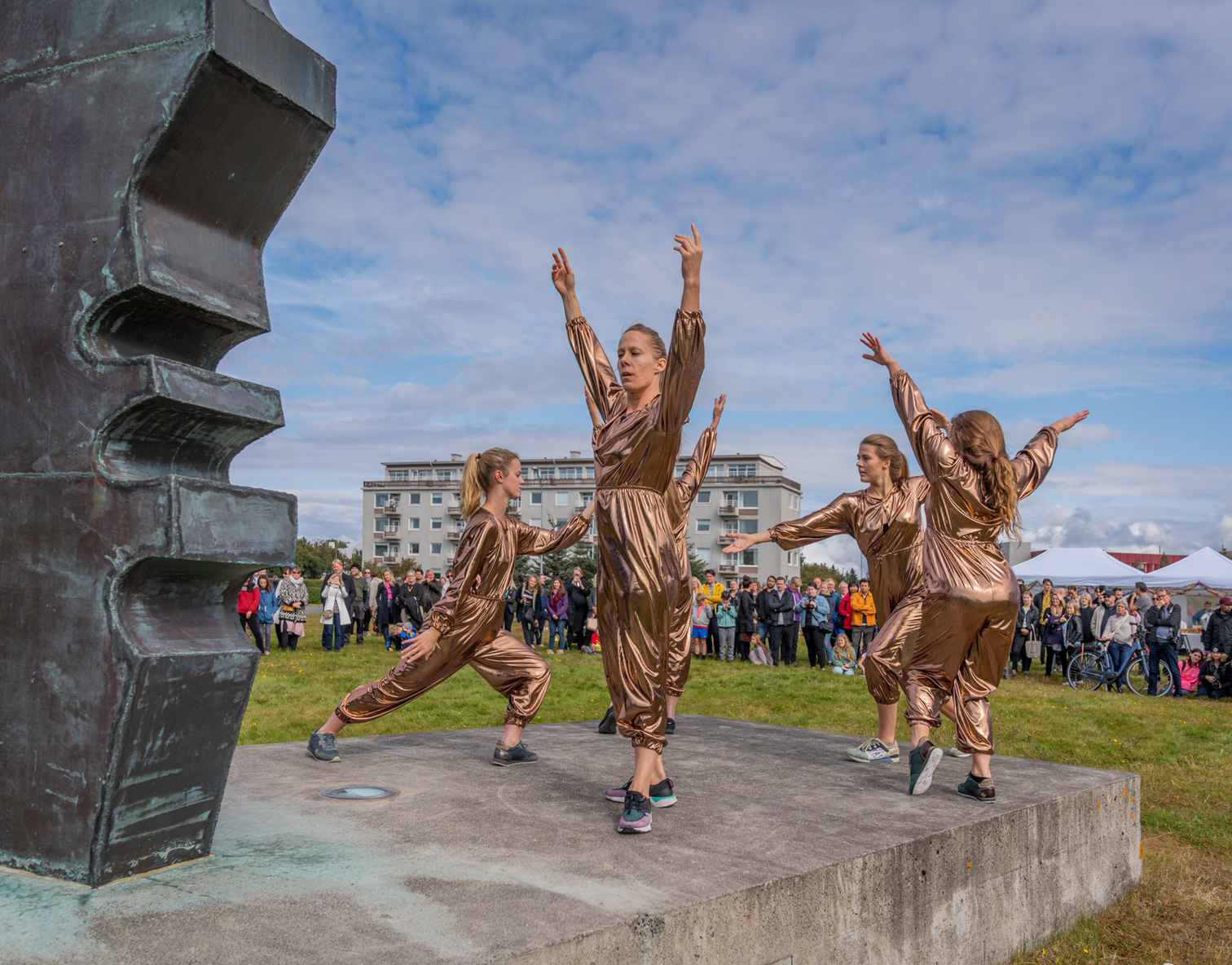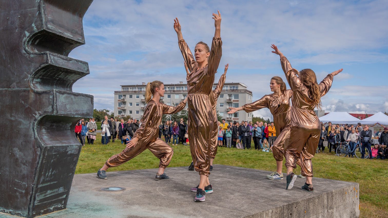 Á myndinni eru meðlimir Dansverkstæðisins og Dansgarðsins að flytja verkið The Practice Performed við opnun Menningarnætur 2019 á Hagatorgi.
