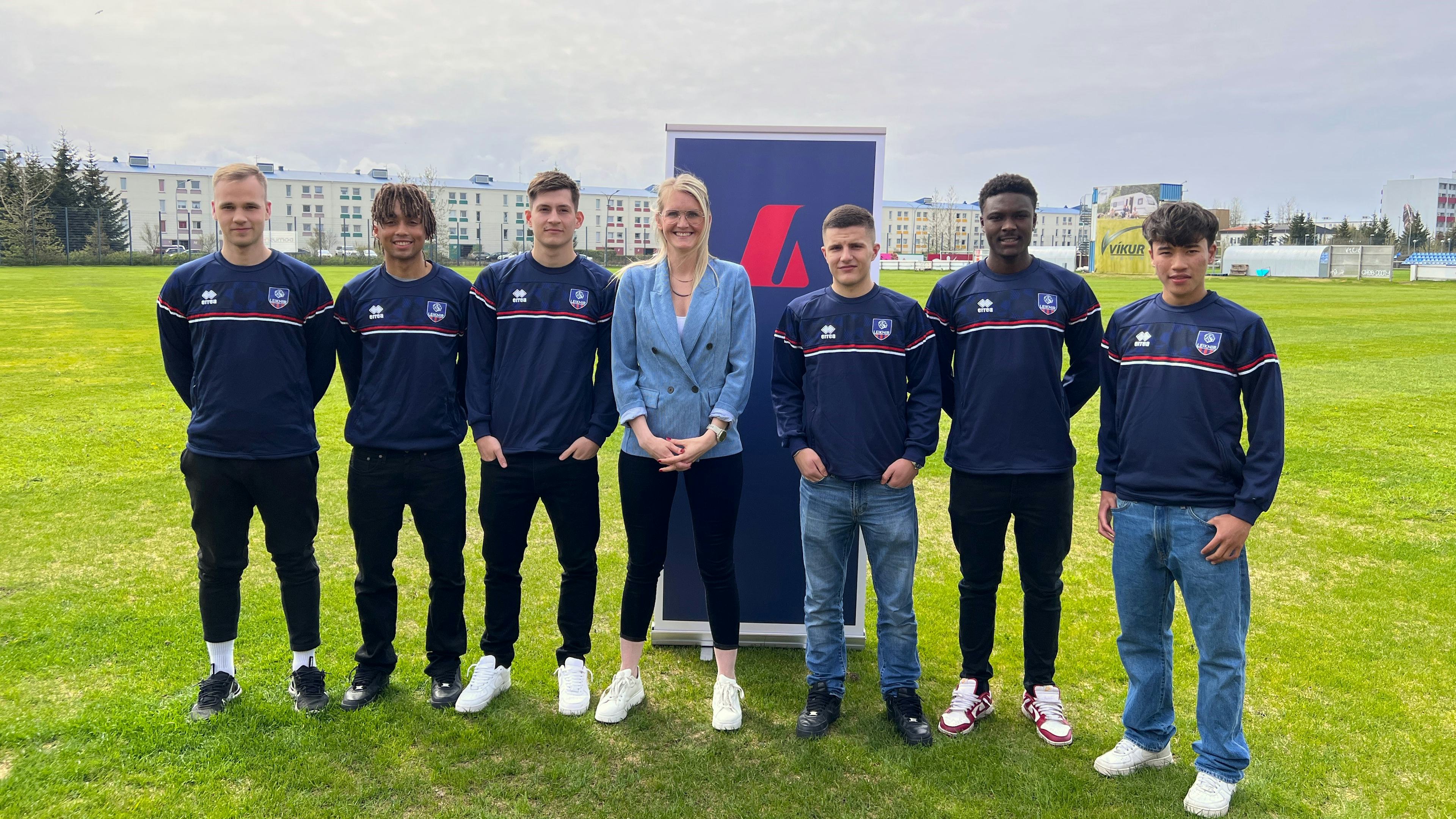 Á myndinni er hluti af leikmönnum meistaraflokks karla í Leikni ásamt Söru Pálsdóttur, framkvæmdastjóra Samfélagssviðs Landsbankans. Leikmenn f.v.: Daníel Finns Matthíasson, Róbert Quental Árnason, Andi Hoti, Shkelzen Veseli, Omar Sowe og Karan Gurung.