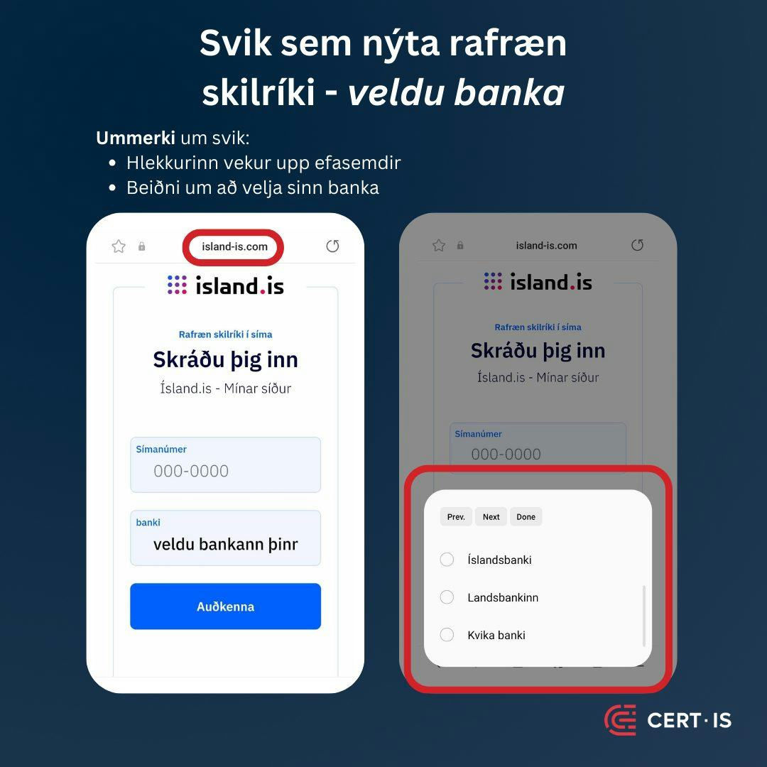 Ísland.is hefur varað við netsvikum sem snúast um að biðja fólk um að nota rafrænu skilríkin sín til að skrá sig inn í heimabanka. Enginn banki notar Ísland.is fyrir slíka innskráningu.