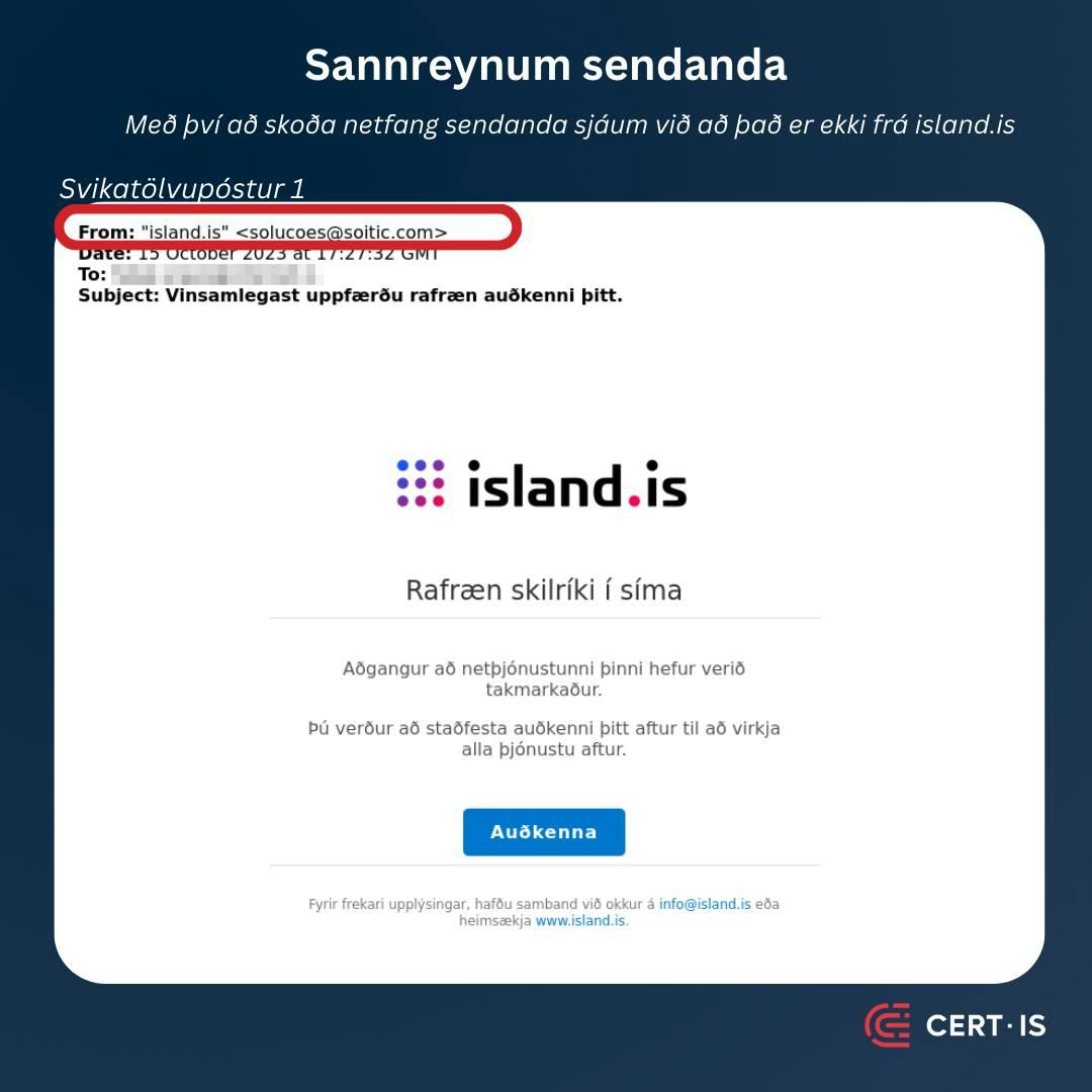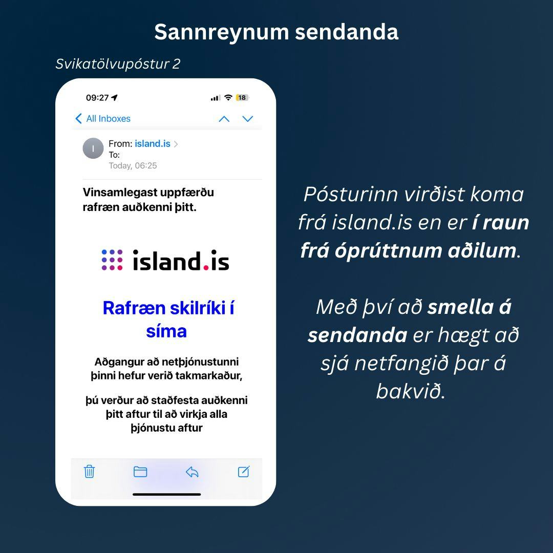 Við ítrekum einnig að mikilvægt er að skoða vel hvaðan skilaboð berast (úr hvaða síma/netfangi) og samþykkja alls ekki innskráningu með rafrænum skilríkjum í hugsunarleysi heldur aðeins ef þú ert viss um að ætla að nota þau í raun og veru.