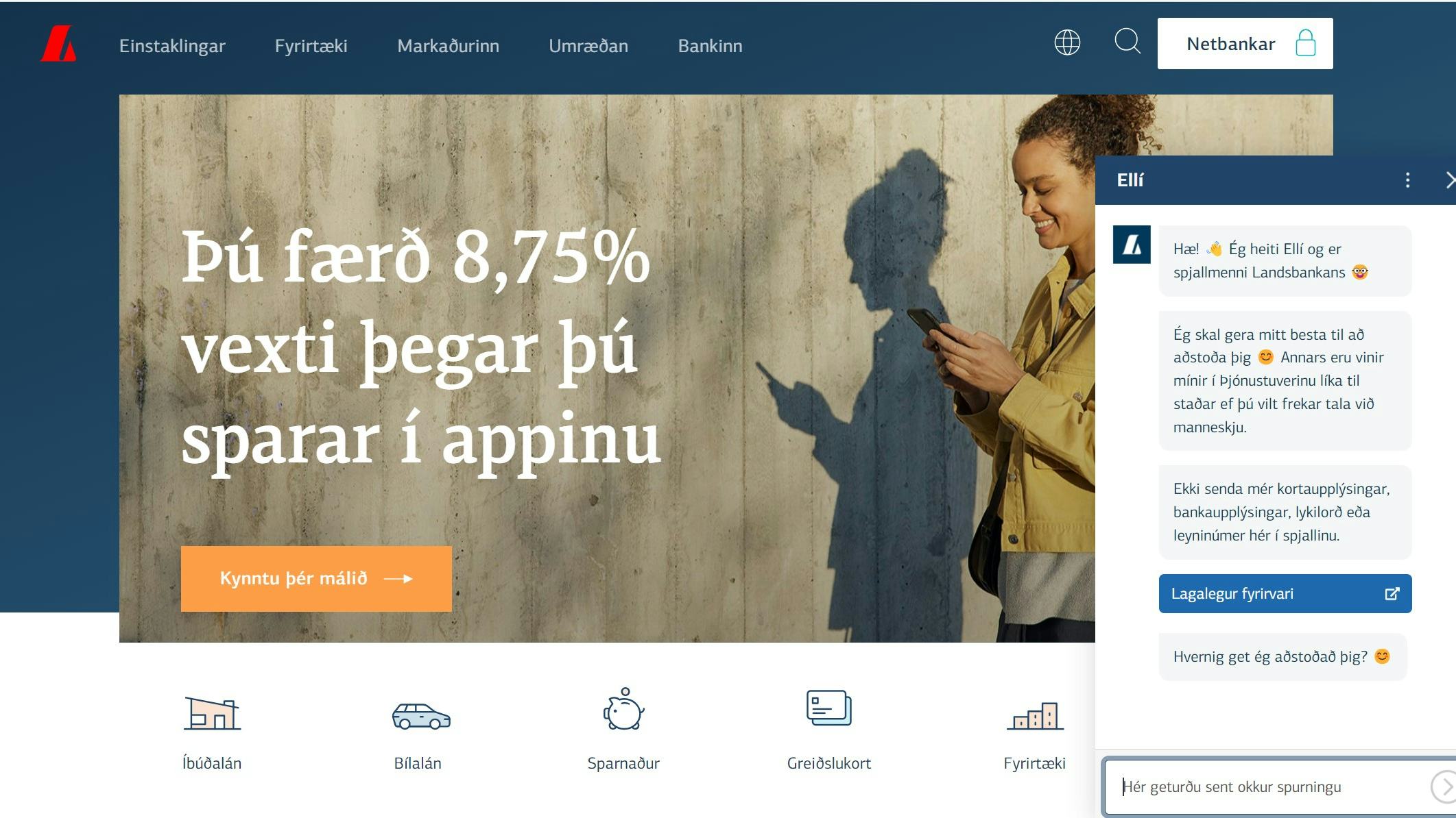 Netspjallið á vef Landsbankans er nú orðið enn öflugra eftir að við tókum í notkun nýtt spjallmenni sem getur svarað einföldum en samt mjög fjölbreyttum, fyrirspurnum um bankaþjónustu og fjármál og leiðbeint viðskiptavinum í notkun sjálfsafgreiðslulausna.