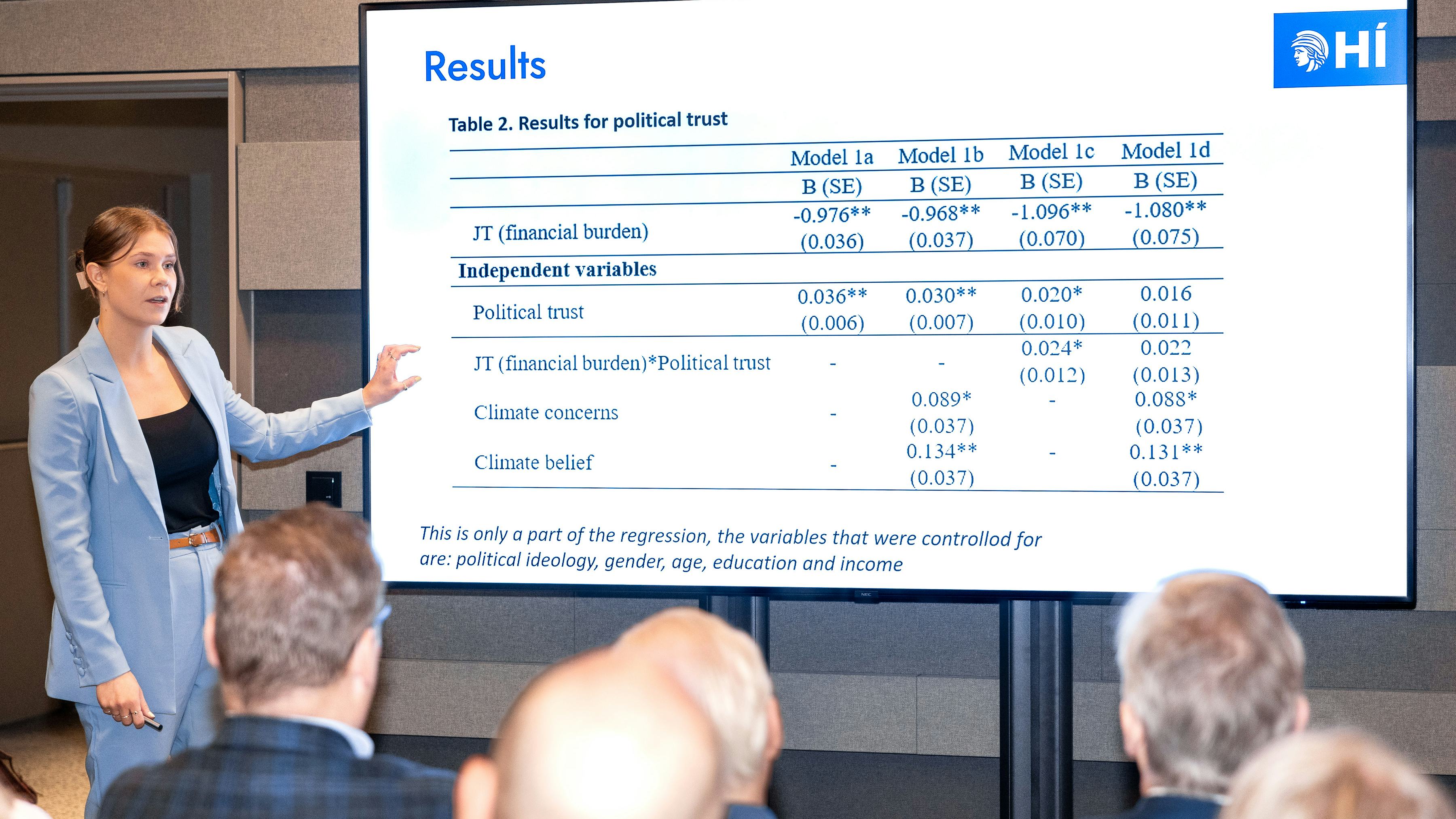 Sóllilja Bjarnadóttir, doktorsnemi við Félagsvísindasvið, er að rannsaka hvernig pólitískt traust og traust til annarra stofnana samfélagsins hefur áhrif á viðhorf almennings til aðgerða í loftslagsmálum. Hún skoðar hvort einstaklingar upplifi loftslagsaðgerðir sem kostnaðarsamar fyrir það persónulega og hvernig traust hefur áhrif á þetta flókna samband, bæði á Íslandi og í tólf öðrum Evrópulöndum. Hún fjallar um að loftslagsaðgerðir hafi mismunandi áhrif á ólíka samfélagshópa og að mikilvægt sé að hvert samfélag tryggi að umskiptin yfir í grænni samfélagsgerð byggist á réttlæti. Niðurstöður hennar sýna að traust til stofnana virðist vera grunnstoð í því að samræma markmið loftslagsverndar og félagslegs réttlætis, bæði hér á landi og í Evrópu.