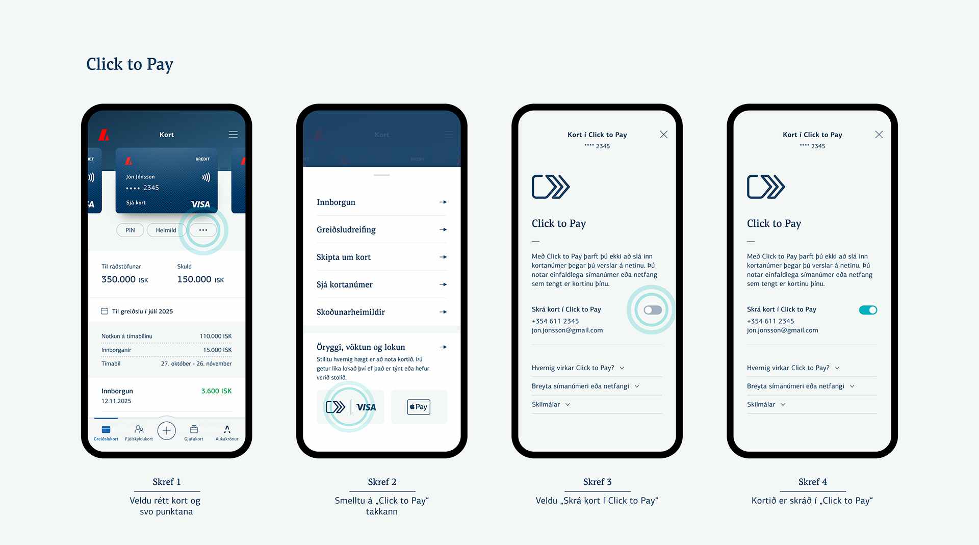 Þau sem nota Click to Pay þurfa ekki lengur að slá inn kortanúmer, öryggisnúmer (CVV) eða gildistíma korta þegar greitt er á netinu.