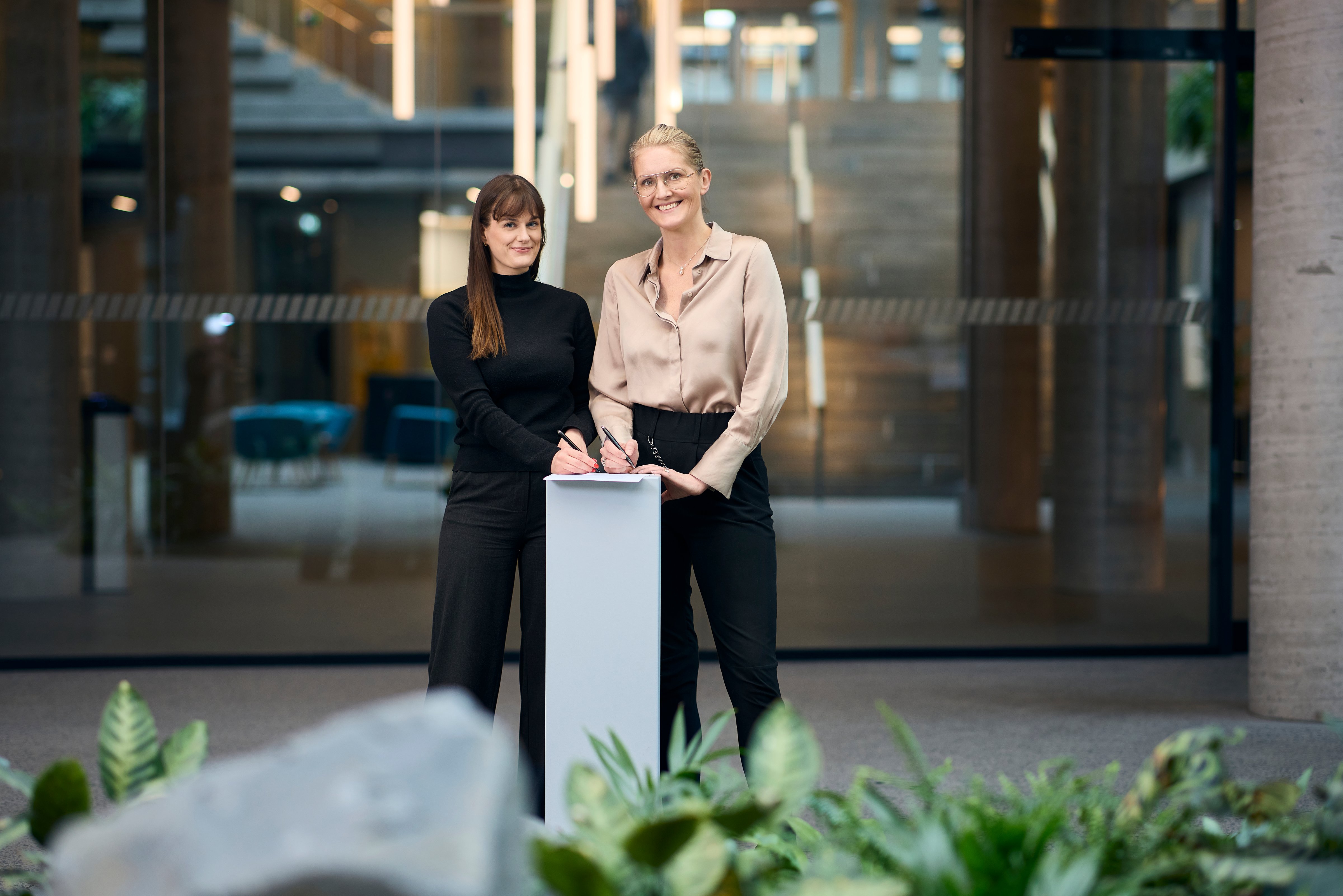 Sara Pálsdóttir, framkvæmdastjóri Samskipta og menningar hjá Landsbankanum og Heiður Anna Helgadóttir, framkvæmdastjóri Félagsstofnunar stúdenta, undirrituðu samninginn.