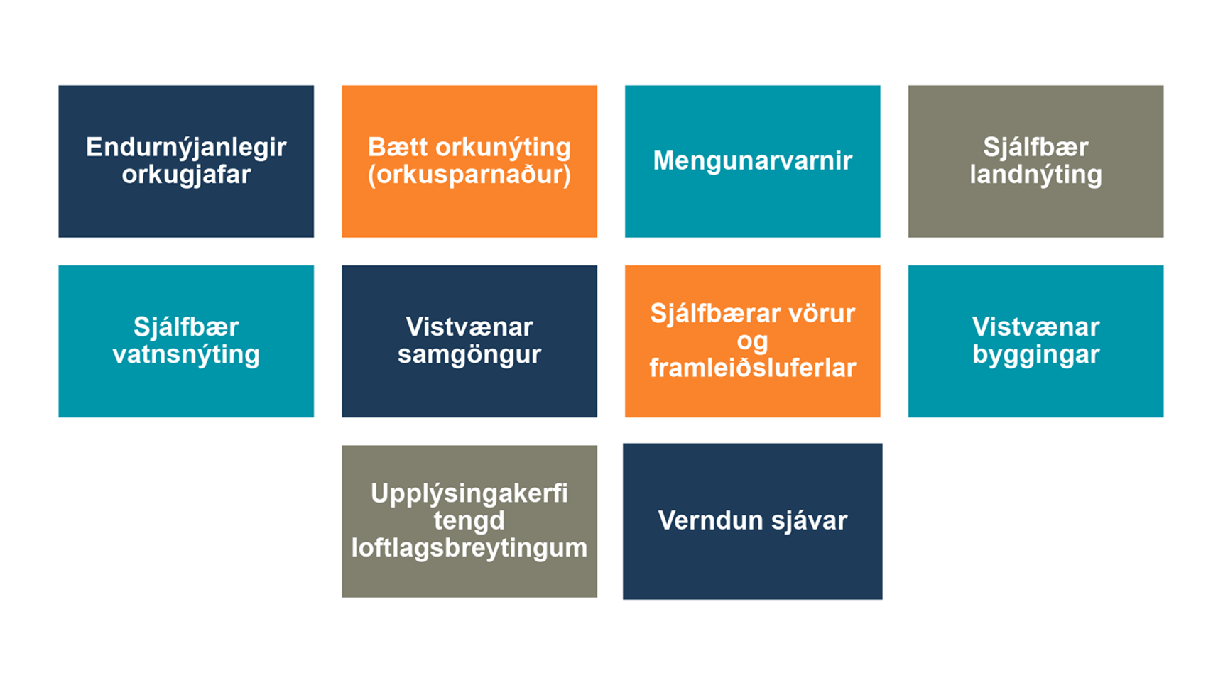 ICMA er búið að skilgreina tíu yfirflokka af grænum verkefnum sem eru:
