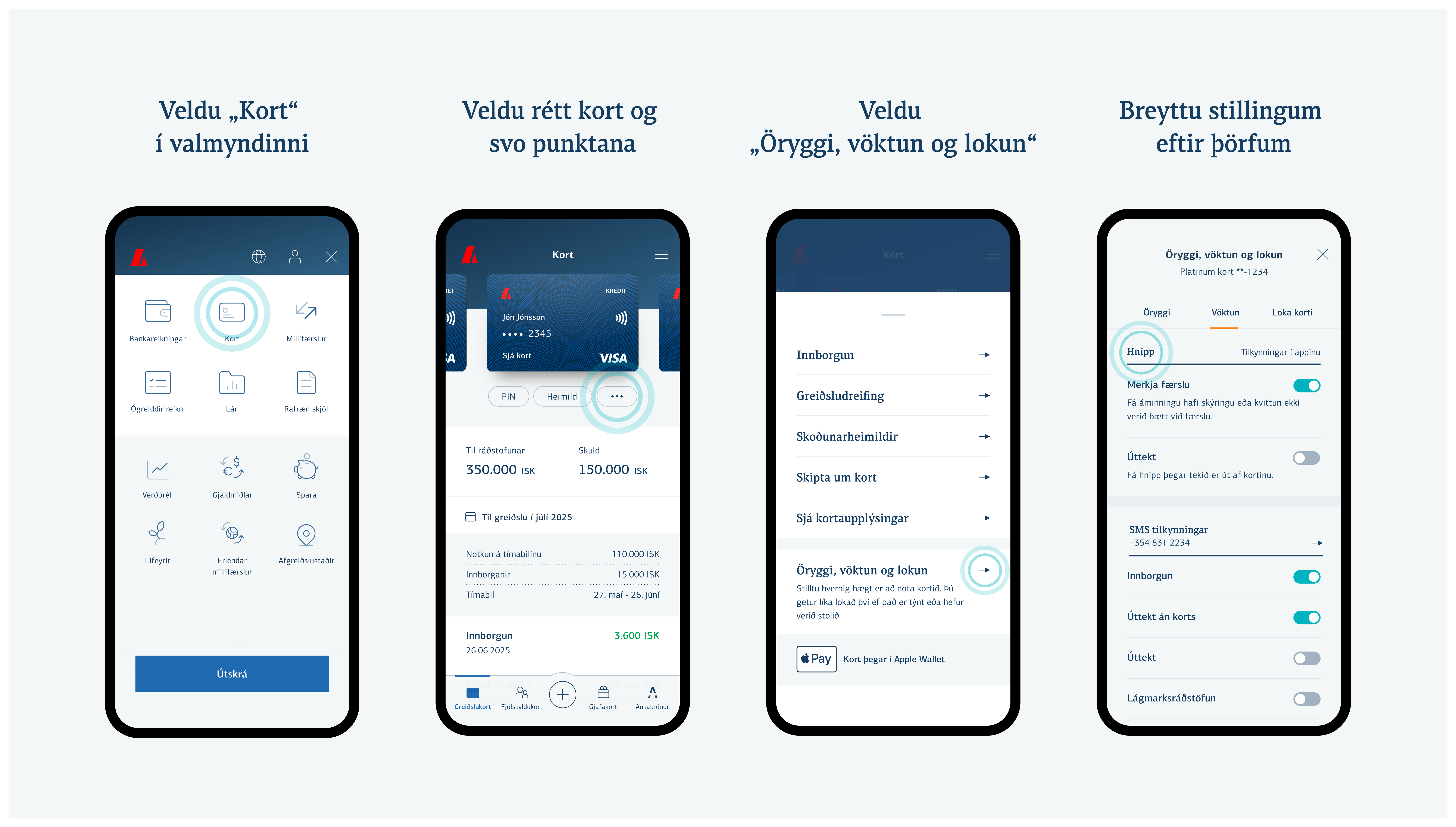 Í appi og netbanka er hægt að bæta viðhengi eins og greiðslukvittun eða nótu við kortafærslur, setja inn skýringu og velja viðeigandi færslulykil.