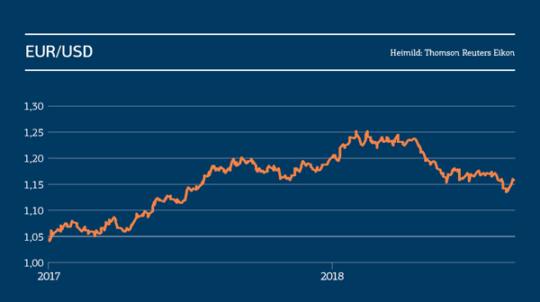 Frá áramótum hefur Bandaríkjadalur styrkst nokkuð gagnvart evrunni. Evra kostar nú um USD 1,14 í samanburði við USD 1,25 um áramót. Eins og gildir um íslensku krónuna er til gengisvísitala fyrir Bandaríkjadal (e. U.S. Dollar Index) sem mælir verðgildi dollarsins á móti körfu gjaldmiðla helstu viðskiptalanda Bandaríkjanna. Alls hefur Bandaríkjadalur styrkst um 3,2% frá áramótum á móti þessari körfu.