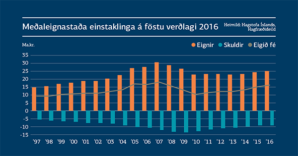 Meðaleign einstaklinga var rúmar 25 m.kr. á árinu 2016 og meðalskuld 9,1 m.kr. Samkvæmt tölum Hagstofunnar var eigið fé meðalmannsins því um 16 m.kr. á árinu 2016. Sé litið á þróun síðustu ára á föstu verðlagi má sjá að eignir hafa aukist allt frá árinu 2013 og skuldir hafa minnkað stöðugt frá árinu 2010. Á milli áranna 2009 og 2016 minnkaði meðaleign á föstu verðlagi um 1,4 m.kr., skuldir lækkuðu um 4,5 m.kr. og eiginfjárstaðan batnaði því um 3,1 m.kr. hjá meðaleinstaklingi.