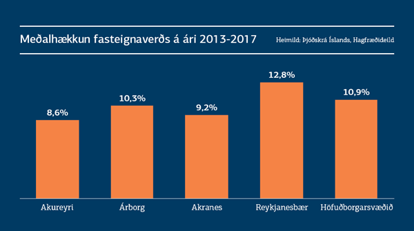 Sé litið á meðalhækkun fasteignaverðs á ári allt tímabilið frá 2012 sést að hún var mest í Reykjanesbæ, tæplega 13% á ári að meðaltali og þar á eftir kemur höfuðborgarsvæðið með um 11% meðalhækkun á ári. Hinir bæirnir koma skammt á eftir en minnsta hækkunin hefur verið á Akureyri, tæplega 9% að meðaltali á ári.