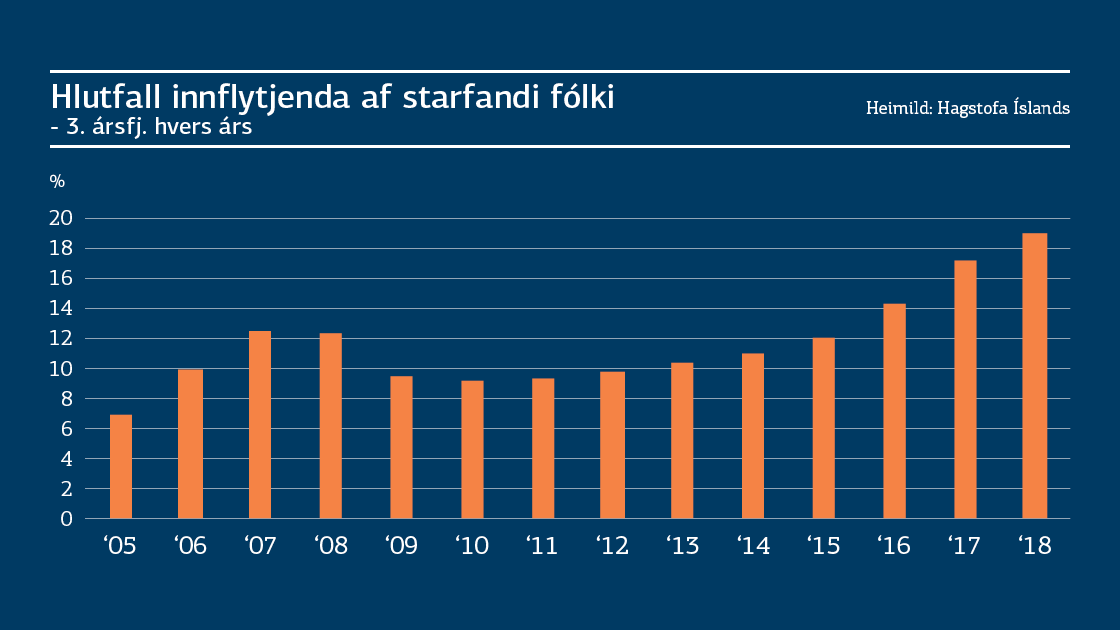 Fjölgun útlendinga á íslenskum vinnumarkaði er þó nokkuð meiri en gildir um íbúafjöldann. Á þriðja ársfjórðungi síðasta árs voru um 210 þús. starfandi á íslenskum vinnumarkaði, þar af voru um 170 þús. með íslenskan bakgrunn og um 40 þús. innflytjendur. Hlutfall innflytjenda á vinnumarkaði hér á landi var því um 19%, en var rúmlega 9% á árinu 2010.