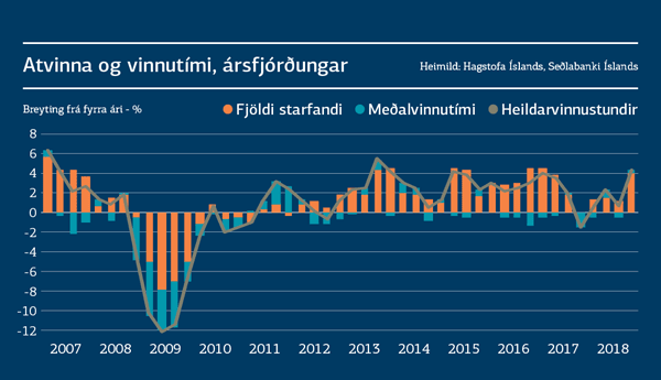Sé litið á breytinguna milli þriðja ársfjórðungs 2017 og 2018 fjölgaði heildarvinnustundum mikið, eða um 4,3%. Aukningin var töluvert umfram ársvöxt undanfarinna fimm fjórðunga. Meðalvinnuvikan lengdist um 0,3% og starfandi fólki fjölgaði um 4,1%. Spenna á vinnumarkaðnum er því ekki að minnka miðað við þessar tölur og þær eru í ágætu samræmi við þær hagvaxtartölur sem Hagstofan hefur birt á árinu. Töluverður kraftur virðist því enn fyrir hendi á vinnumarkaðnum.