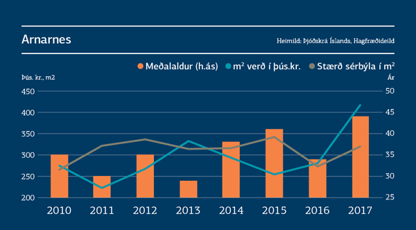 Ætla mætti að hluti af skýringunni fyrir miklum breytingum á fermetraverði síðustu ár liggi í því að stærri sérbýli hafi verið seld 2016 sem almennt lækkar fermetraverð. Raunin er önnur, en meðalstærð seldra sérbýla jókst milli áranna 2016 og 2017 og var aukningin mest á höfuðborgarsvæðinu, eða 46 m2. Að sama skapi mætti telja að meðalaldur sérbýla færi lækkandi þegar fermetraverð hækkar. Raunin var einnig önnur á Arnarnesi milli áranna 2016 og 2017. Meðalaldur sérbýlanna 2016 var 34 ár meðan meðalaldurinn var 44 ár árið 2017.