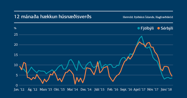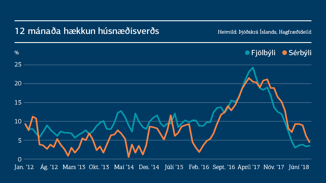 Veruleg hækkun fasteignaverðs á síðustu misserum hefur orðið samhliða lágri verðbólgu og reyndar var verðbólga án húsnæðis lengi neikvæð, eða allt þar til í maímánuði síðastliðnum. Raunhækkun húsnæðisverðs mæld á föstu verðlagi án húsnæðis hefur því verið mikil, en verulega hefur þó hægt á árshækkuninni síðustu mánuði. Þannig var raunverð fasteigna nú í september um 2,1% hærra en það var í september 2017. Þar sem verðbólga er enn tiltölulega lág helst raunverð fasteigna stöðugt, þrátt fyrir hóflegar hækkanir. Hækkun raunverðs síðustu 12 mánuði er verulega minni en árin þar á undan. Samsvarandi tölur voru 23,5% fyrir 2017 og 12,6% fyrir 2016.