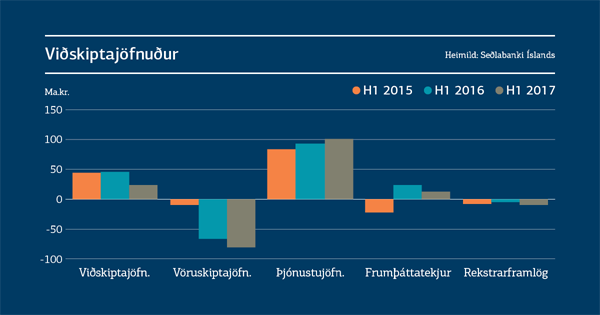 Það var fátt sem kom á óvart í tölum um greiðslujöfnuð við útlönd og erlenda stöðu þjóðarbúsins sem Seðlabankinn birti eftir lokun markaða í gær. Afgangurinn á 2. ársfjórðungi var 16,3 ma.kr., sem er um 16,9 ma.kr. minni afgangur en á sama fjórðungi í fyrra. Afgangurinn á 1. ársfjórðungi var 8,2 ma.kr. sem þýðir að afgangurinn á fyrri árshelmingi var 24,5 ma.kr. sem er um 22,1 ma.kr. minni afgangur en á fyrri árshelmingi 2016.