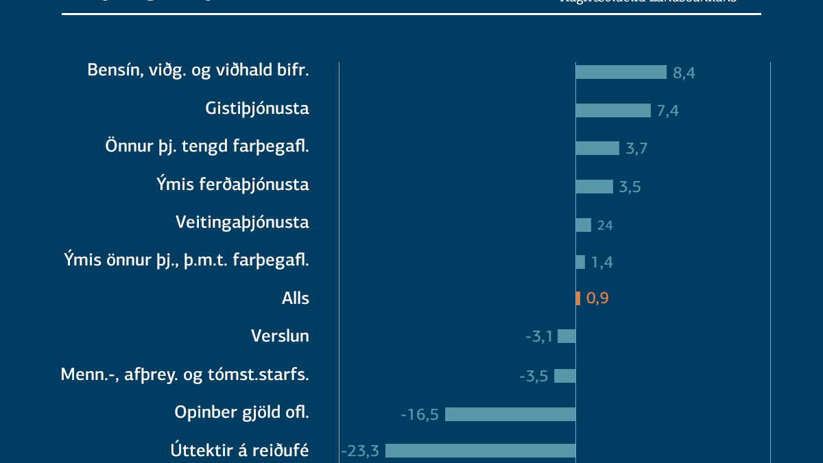 Af stærstu kostnaðarliðunum var mesti samdrátturinn í úttektum á reiðufé, sem nam 23,3%. Næstmesti samdrátturinn lá í opinberum gjöldum en þau drógust saman um 16,5% milli ára. Þriðji mesti samdrátturinn var í menningar-, afþreyingar- og tómstundastarfsemi (3,5%) og fjórði mesti samdrátturinn var í verslun (3,1%). Neysla á öðrum liðum jókst milli ára. Mesta aukningin var í bensíni, viðgerðum og viðhaldi bifreiða (8,4%). Næstmesta aukningin var í gistiþjónustu, eða 7,4%. Aukning annarra liða var minni.