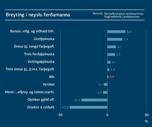 Greiðslukortavelta erlendra ferðamanna nam 259 ma.kr. á síðasta ári og jókst um tæpa 28 ma.kr. milli ára, eða um 12%. Til samanburðar nam fjölgun ferðamanna hingað til lands um Leifsstöð 24%. Hver ferðamaður hefur því að meðaltali dregið úr neyslu sinni um 9,8% mælt í krónum. Þar sem krónan styrktist milli ára er ekkert óeðlilegt að ferðamenn hafi dregið úr neyslu sinni í krónum ef gert er ráð fyrir að neysla ferðamanna mæld í þeirra eigin gjaldmiðli taki litlum breytingum yfir tíma. Sé neyslan sett á fast gengi sést að neyslan jókst um 25,4% sem er eilítið meira en sem nemur fjölgun ferðamanna. Á þennan mælikvarða jókst neysla meðalferðamannsins því um 0,9% milli ára, mælt í erlendri mynt.