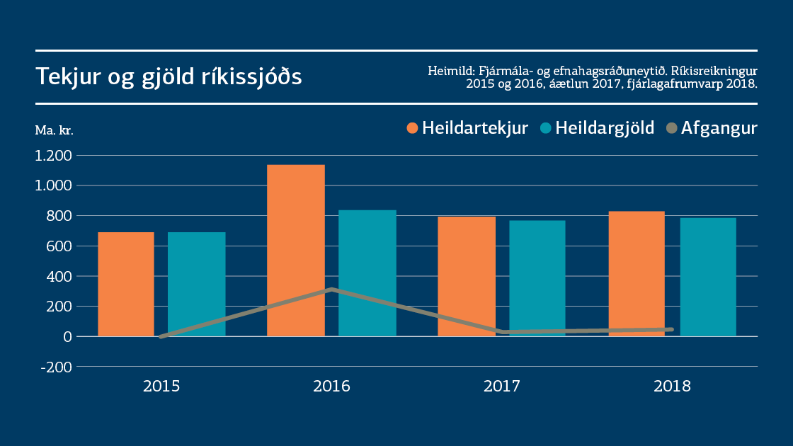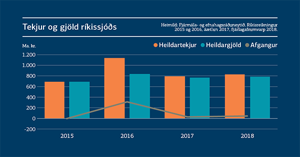 Í fimmta skiptið í röð gerir fjárlagafrumvarpið ráð fyrir hallalausum rekstri ríkissjóðs á árinu. Áætlað er að tekjur ríkissjóðs verði um 834 ma. kr. en gjöld um 790 ma. kr. Ríkissjóður verður þannig rekinn með 44 ma. kr. afgangi á næsta ári. Í ríkisfjármálum er hins vegar stundum langur vegur frá fjárlagafrumvarpi til endanlegs ríkisreiknings, eins og dæmin sanna. Síðustu ár hafa óreglulegir liðir eins og óvæntar arðgreiðslur, endurmat eigna og stöðuleikaframlög bætt stöðu ríkissjóðs með reglubundum hætti. Nú er gert ráð fyrir að heildarafkoma ríkissjóðs verði jákvæð um tæpa 44 ma. kr. króna sem er u.þ.b. fjórum mö.kr. meira en gert var ráð fyrir í fjármálaáætlun. Stefnt er að því að afgangur af rekstri hins opinbera verði aukinn úr 1% af VLF í 1,6% af VLF á næstu tveimur árum, m.a. til þess að vega á móti vexti eftirspurnar í hagkerfinu.