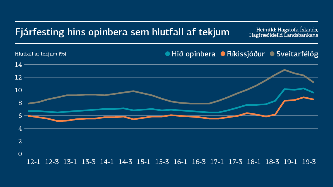 Fjárfesting hins opinbera dróst saman um 3,8% á fyrstu 9 mánuðum ársins 2019 samanborið við sama tímabil fyrra árs. Fjárfestingar ríkissjóðs jukust um 7,7% milli þessara tímabila og fjárfestingar sveitarfélaganna um rúm 15%. Þetta er mun hægari þróun en umfjöllun í fjármálastefnu gefur fyrirheit um og er svo að sjá að opinber fjárfesting hafi fylgt hagvexti síðustu ára nokkuð vel.