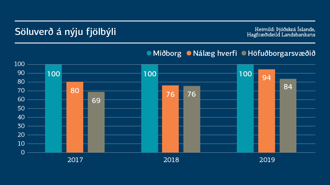Sé litið á söluverð nýrra íbúða síðustu 3 ár sést að munurinn á fermetraverði í miðborg og öðrum hverfum (svokallað miðborgarálag) hefur minnkað mikið. Á árinu 2017 var meðalverð í miðborginni 20% hærra en í nálægum hverfum og rúmlega 30% hærra en á höfuðborgarsvæðinu öllu. Það sem af er árinu 2019 hefur söluverð nýrra íbúða í miðborginni einungis verið 6% hærra en í nálægum hverfum og um 16% hærra en meðaltal höfuðborgarsvæðisins. Það er því ljóst að miðborgarálagið hefur lækkað verulega á þessu tímabili.