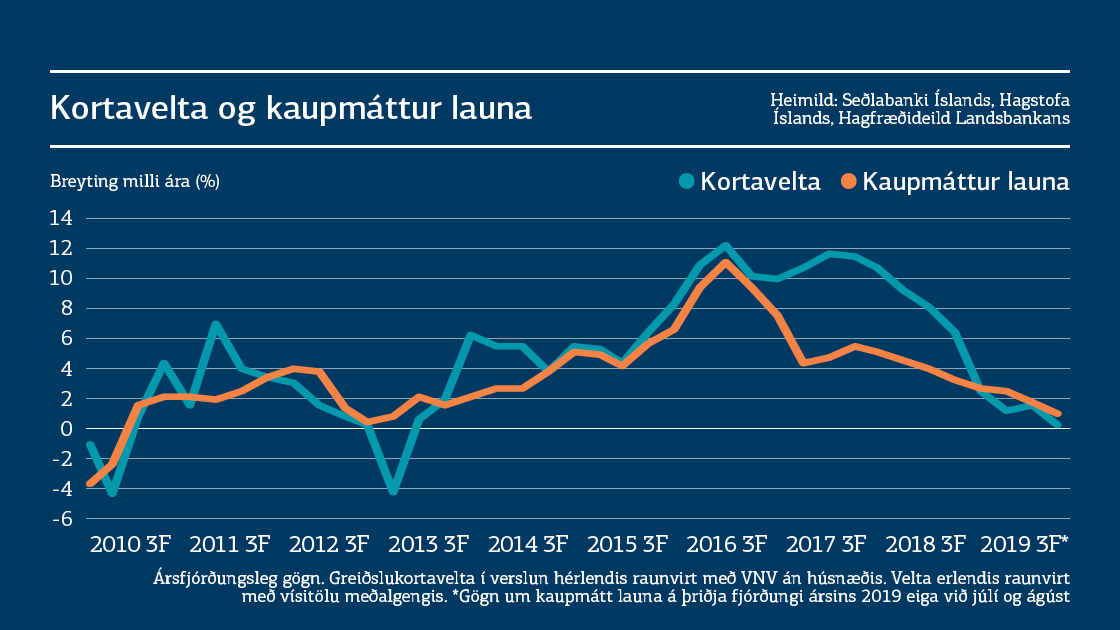 Kortavelta þróast nú í auknum mæli í takt við kaupmátt launa sem bendir til að landsmenn séu síður að eyða umfram efni. Kaupmáttur launa hefur aukist um 1,1% milli ára á fyrstu tveimur mánuðum þriðja ársfjórðungs sem er tæpu prósentustigi ofar aukningunni í kortaveltu á þriðja ársfjórðungi.