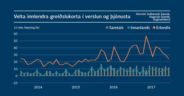 Samsetning veltunnar hefur haldið áfram að þróast innlendri verslun og þjónustu í óhag. Í nóvember var um 18,7% allra greiðslukortaviðskipta Íslendinga beint við erlenda aðila. Þessi viðskipti eru einkum kaup Íslendinga á vörum og þjónustu á ferðalögum erlendis og netverslun við erlenda aðila. Þetta hlutfall hefur hækkað nær stöðugt allt frá árinu 2014. Fyrstu ellefu mánuði ársins var hlutfallið 17,3% en var á sama tíma í fyrra 15,4%. Það sem af er þessu ári hefur ferðalögum Íslendinga út fyrir landssteinana fjölgað um 16% en aukning í erlendum sendingum hjá Íslandspósti nam um 60% fyrstu 11 mánuði ársins. Einkaneysla er í sögulegu hámarki og eykst nú hraðar en kaupmáttur launa en það bendir til þess að hún sé nú í meiri mæli knúin áfram af skuldsetningu og notkun sparifjár en síðustu misseri.