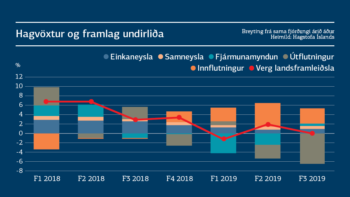 Samdrátt landsframleiðslu á þriðja fjórðungi má einungis skýra með miklum samdrætti í útflutningi. Samdrátturinn nam 12,9% miðað við sama tímabil í fyrra. Ársfjórðungsgögn Hagstofunnar ná aftur til ársins 1995 og frá þeim tíma er þetta mesti samdráttur útflutnings á einum fjórðungi sem mælst hefur. Bæði útflutningur vöru og þjónustu dróst saman á fjórðungnum. Vöruútflutningur dróst saman um 5,2% en þjónustuútflutningur um 16,7% og skýrist samdráttur útflutnings vöru og þjónustu að megninu til af samdrætti þjónustuútflutnings. Sá samdráttur skýrist síðan aftur af brotthvarfi WOW air á þessu ári.