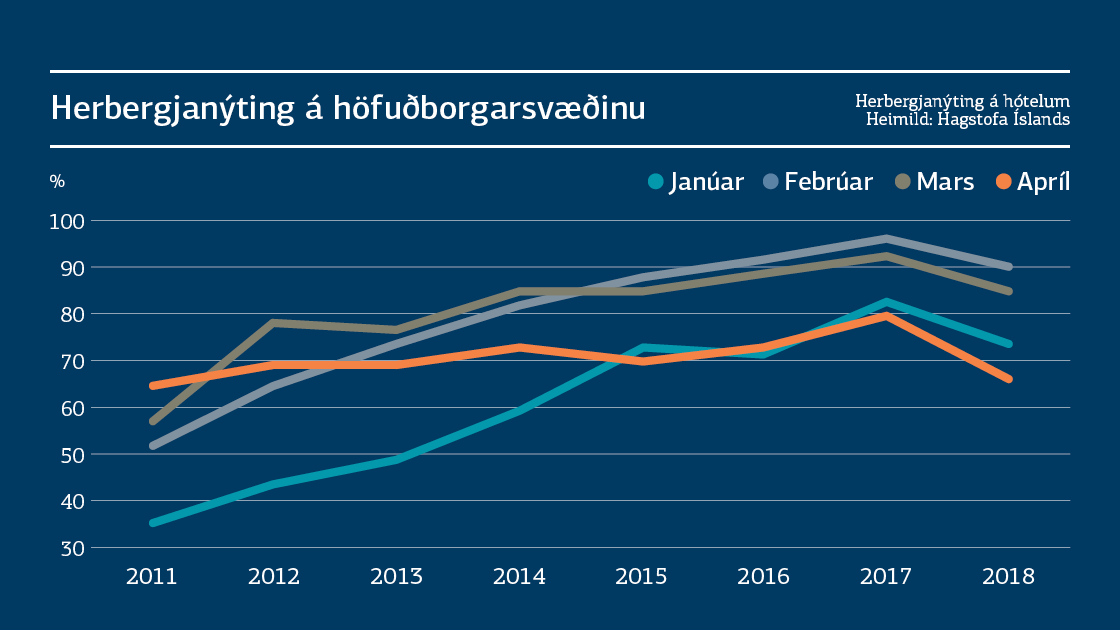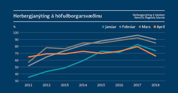 Herbergjanýting á hótelum á höfuðborgarsvæðinu í apríl nam 65,7% og hefur hún ekki mælst minni í apríl síðan 2011. Til samanburðar var nýtingin 79,7% á síðasta ári. Það sem af er ári hefur herbergjanýtingin verið verri en á sömu tímapunktum í fyrra. Raunar þarf að fara aftur til áranna 2015 og 2016 til að finna verri herbergjanýtingu en á fyrstu þremur mánuðum ársins. Fyrir janúarmánuð þarf að fara aftur til ársins 2016 til að finna verri nýtingu en aftur til ársins 2015 til að finna verri nýtingu fyrir febrúar og mars. Að fara þurfi allt aftur til ársins 2011 til að finna verri nýtingu eru því nokkur tíðindi.