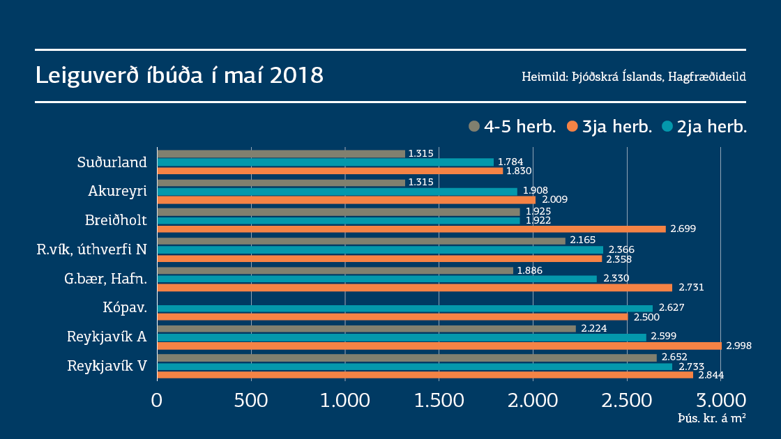 Hæsta leiguverðið fyrir 2ja herbergja íbúðir er í austurhluta Reykjavíkur og hæsta verðið fyrir 3ja herbergja íbúðir er í vesturhluta Reykjavíkur. Miðborg Reykjavíkur telst hér til vesturhlutans. Hér er leiguverðið borið saman milli maímánaða 2017 og 2018. Vísitala leiguverðs hækkaði um 7,2% á milli þessara tímabila.