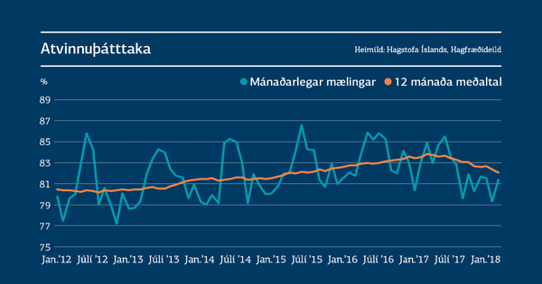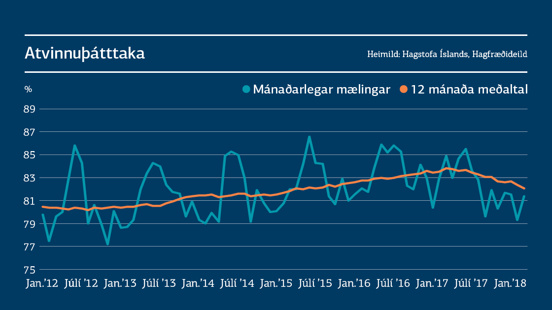 Atvinnuþátttaka jókst stöðugt frá upphafi ársins 2015 fram til vorsins 2017. Síðan þá hefur dregið úr atvinnuþátttöku um eitt og hálft prósentustig sé miðað við 12 mánaða hlaupandi meðaltal og hefur hlutfallið lækkað töluvert síðustu tvo mánuði. Atvinnuþátttaka er eftir sem áður mikil hér á landi og er nú álíka og hún var um mitt ár 2015 og til muna hærri en hún var á árinu 2012.