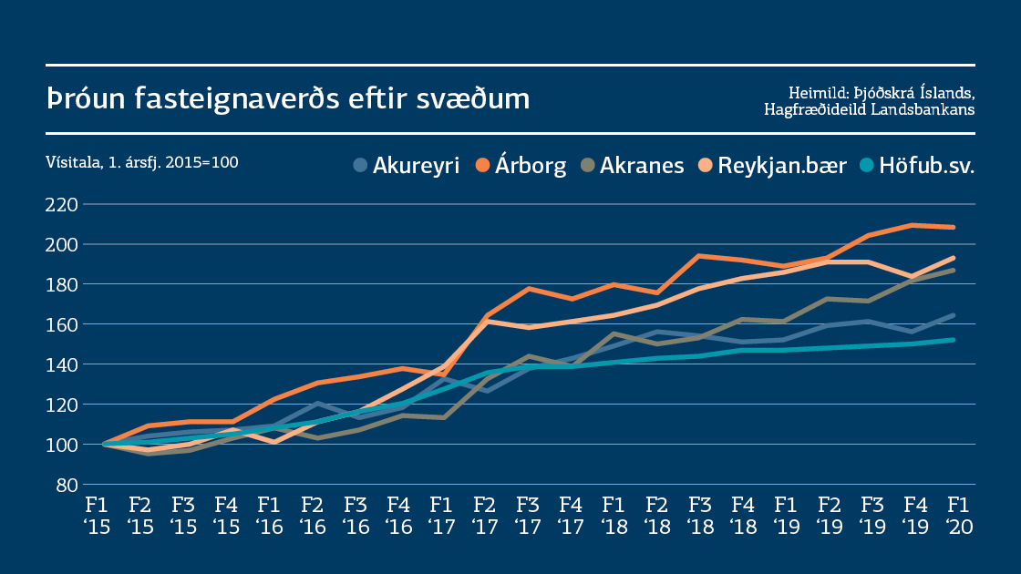 Sé litið til þróunar á milli 1. ársfjórðungs 2019 og 2020 má sjá að íbúðaverð hækkaði mest á Akranesi um 16%, næstmest í Árborg um ríflega 10% og um 8% á Akureyri. Á höfuðborgarsvæðinu hefur verð hækkað um 3,4% yfir tímabilið.