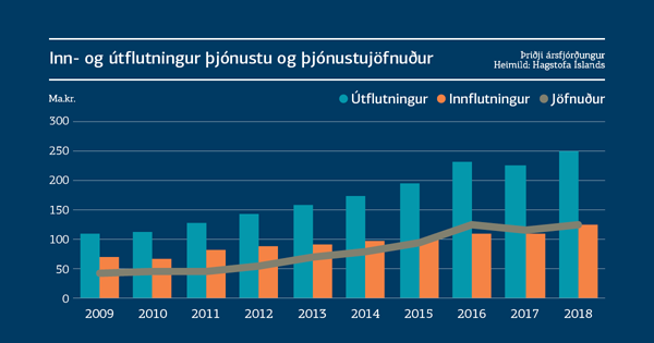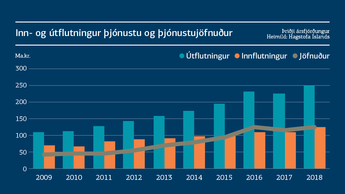 Þjónustuútflutningur nam 248,5 mö. kr. á þriðja ársfjórðungi og jókst um 23,2 ma. kr., eða 10,3%, á milli ára. Þjónustuinnflutningur nam 127,4 mö. kr. og jókst um 15,4 ma. kr., eða 14%. Afgangur á þjónustujöfnuði nam því 123,7 mö. kr. og jókst um 7,8 ma. kr., eða 6,7%. Þetta er metafgangur á þjónustujöfnuði á þriðja ársfjórðungi en fyrra met var frá árinu 2016 þegar afgangurinn mældist 122,8 ma. kr.
