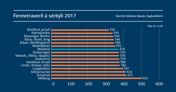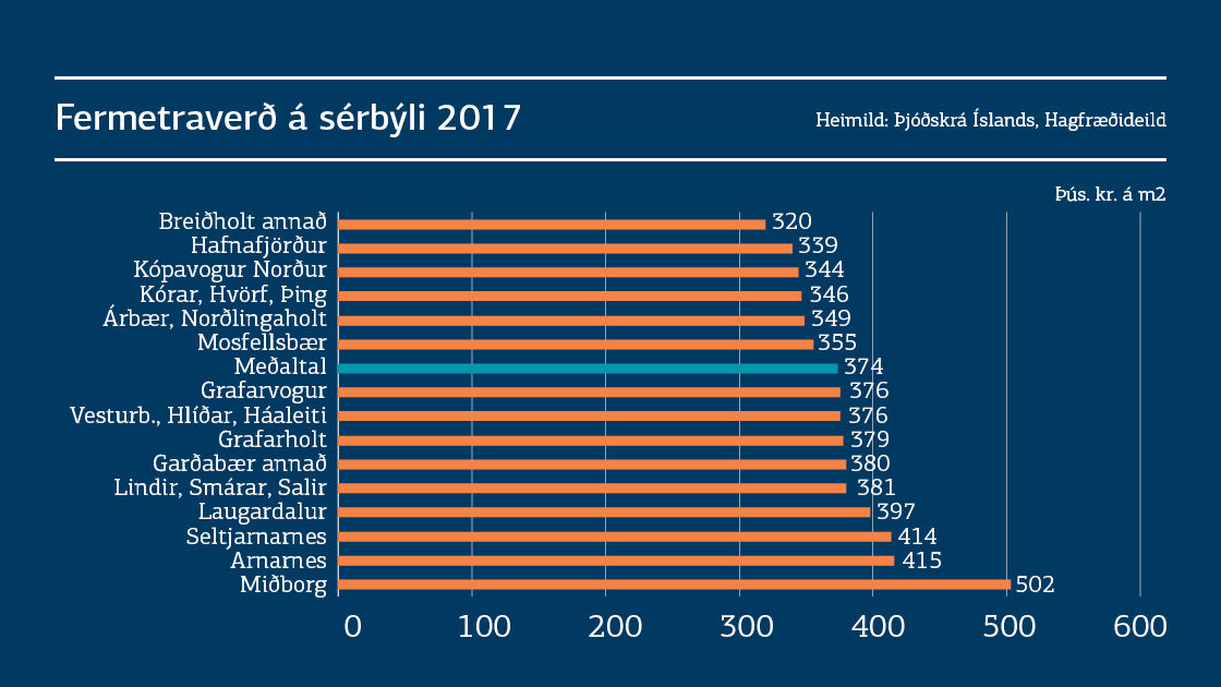 Á árinu 2017 var hæsta meðalverð sérbýlis á höfuðborgarsvæðinu í miðborginni um 502 þús. kr. á m2 sem er um 21% hærra verð en í næsta hverfi á eftir. Næst dýrasta hverfið var Arnanesið og í þriðja sæti Seltjarnarnes. Af 10 dýrustu hverfunum á höfuðborgasvæðinu eru 5 í Reykjavík þar sem Laugardalur er í 4. sæti, Grafarholt í 7. sæti og Vesturbær, Hlíðar og Háaleiti í 8. sæti.