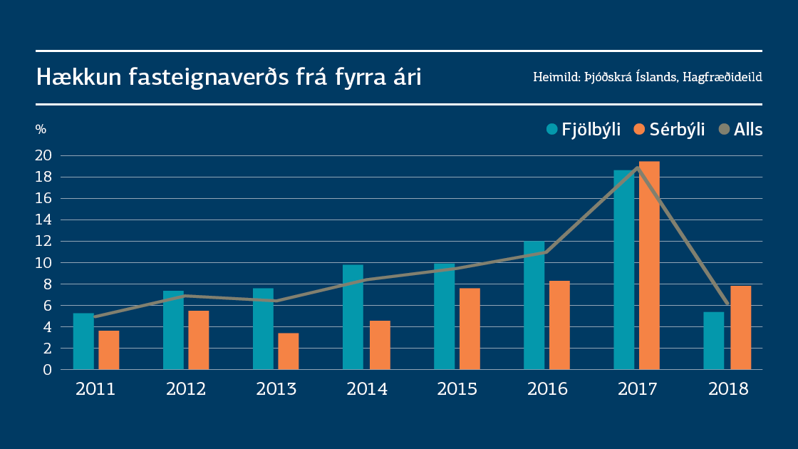 Hækkun raunverðs síðustu 12 mánuði er mun minni en árin tvö þar á undan. Samsvarandi tölur voru 15,5% fyrir 2017 og 15,9% fyrir 2016.