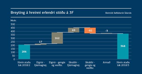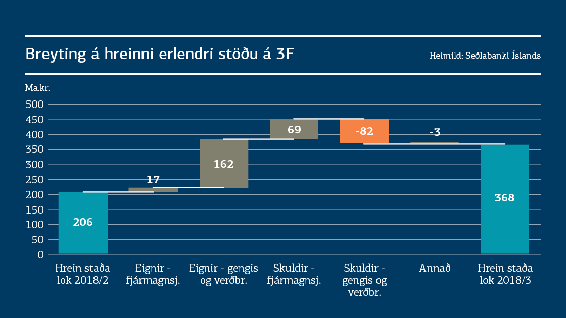 Í lok þriðja ársfjórðungs námu erlendar eignir þjóðarbúsins 3.380 mö. kr. og erlendar skuldir 3.012 mö. kr. Hrein staða var því jákvæð um sem nemur 386 mö. kr., eða 13% af VLF.