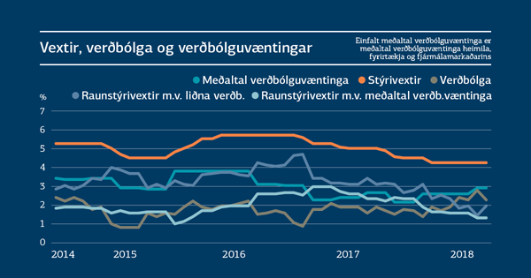 Flestir mælikvarðar benda til þess að um þessar mundir sé hagkerfið komið yfir topp uppsveiflunnar og framundan sé hóflegri vöxtur sem samræmist betur framleiðslugetu þjóðarbúsins til lengri tíma. Ferðaþjónustan, sem drifið hefur hagvöxt síðustu ára, mun líkast til vaxa mun hægar á þessu ári og næstu árum en verið hefur undanfarin ár. Skýr merki eru einnig um minni þenslu á vinnumarkaði. Seðlabankinn áætlar að framleiðsluspenna hagkerfisins sé um 1% um þessar mundir og að hún fari minnkandi á næstu misserum. Þetta er umtalsvert minni spenna en þegar hún var mest á árinu 2016 en þá var hún 3,4%. Minnkandi spenna gefur að öðru óbreyttu ástæðu til þess að draga úr aðhaldi peningastefnunnar.