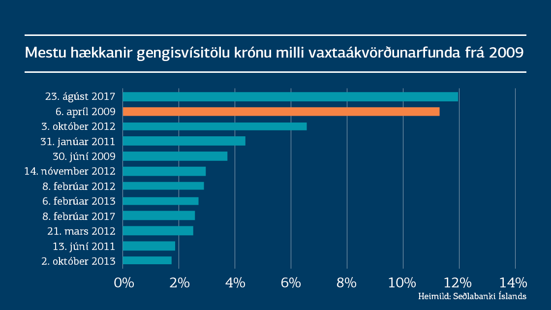 Það er óhætt að segja að mikið vatn hafi runnið til sjávar frá síðasta vaxtaákvörðunarfundi nefndarinnar þann 14. júní síðastliðinn. Það helgast af mjög mikilli veikingu á gengi krónunnar á tímabilinu. Þannig hefur gengisvísitalan hækkað um 12% frá síðasta fundi. Peningastefnunefndin er á alveg nýjum slóðum að þessu leyti enda er þetta mesta lækkun krónu gagnvart evru milli funda peningastefnunefndar frá því hún tók til starfa á vormánuðum 2009. Milli tveggja fyrstu funda nefndarinnar í mars og apríl 2009 hækkaði gengisvísitalan um 11,3%. Þá lækkaði nefndin reyndar vexti milli funda en staðan þá er engan veginn sambærileg við núverandi aðstæður enda voru nafnvextir þá 17%, gjaldeyrishöftum hafði verið komið á og mikill framleiðsluslaki til staðar. Þriðja mesta lækkun gengisins þarna á eftir var milli ágúst- og októberfunda árið 2012 en þá hækkaði gengisvísitalan um 6,5%. Þetta er því mun meiri veiking en nefndin á að venjast og athyglisvert hver framvirk leiðsögn nefndarinnar verður vegna þessa.