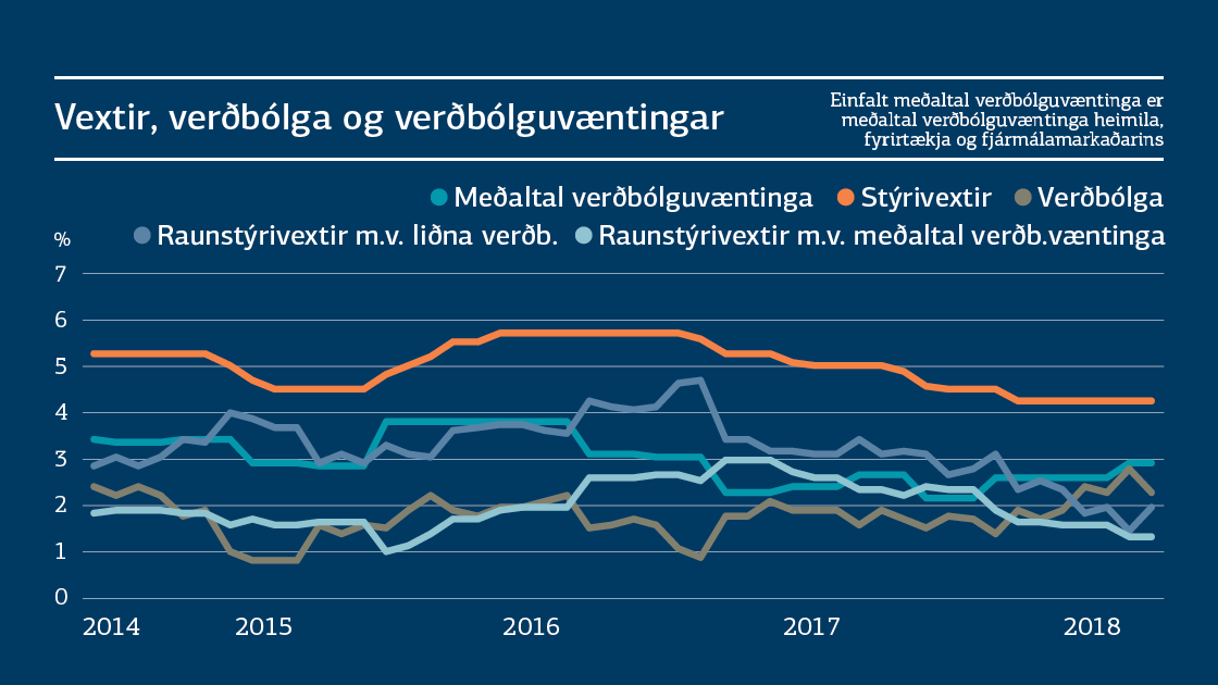 Flestir mælikvarðar benda til þess að um þessar mundir sé hagkerfið komið yfir topp uppsveiflunnar og framundan sé hóflegri vöxtur sem samræmist betur framleiðslugetu þjóðarbúsins til lengri tíma. Ferðaþjónustan, sem drifið hefur hagvöxt síðustu ára, mun líkast til vaxa mun hægar á þessu ári og næstu árum en verið hefur undanfarin ár. Skýr merki eru einnig um minni þenslu á vinnumarkaði. Seðlabankinn áætlar að framleiðsluspenna hagkerfisins sé um 1% um þessar mundir og að hún fari minnkandi á næstu misserum. Þetta er umtalsvert minni spenna en þegar hún var mest á árinu 2016 en þá var hún 3,4%. Minnkandi spenna gefur að öðru óbreyttu ástæðu til þess að draga úr aðhaldi peningastefnunnar.