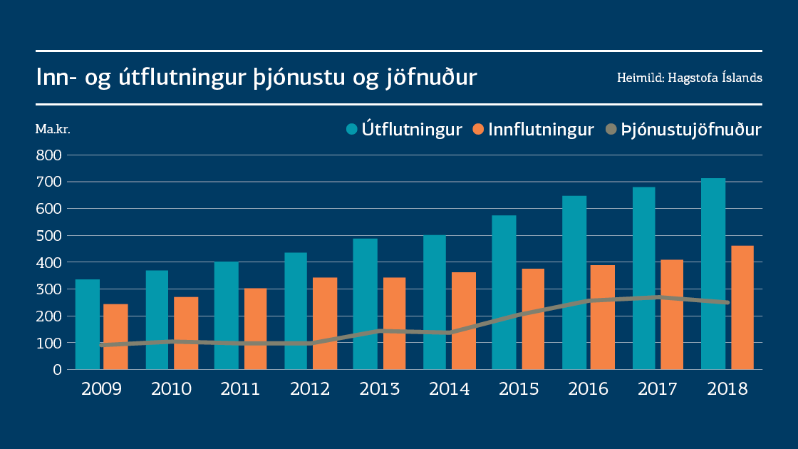Þjónustuútflutningur nam 708,7 ma. kr. á síðasta ári og jókst hann um 32,9 ma. kr. eða um 4,9% milli ára. Þjónustuinnflutningur nam hins vegar 463 ma. kr. og jókst hann um 58,6 ma. kr. eða um 14,5%. Þjónustujöfnuður nam því 245,7 ma. kr. og dróst saman um 25,7 ma. kr. Þetta er í fyrsta skiptið síðan 2014 að þjónustujöfnuður dregst saman en þá dróst hann saman um 6,9 ma. kr. Jöfnuður þjónustu er þrátt fyrir það hár í sögulegu ljósi og er þetta þriðji mesti þjónustujöfnuður í íslenskri hagsögu á eftir árunum 2016 og 2017. Samdráttinn í þjónustujöfnuði síðasta árs má í raun rekja til meiri vaxtar í innflutningi þjónustu en útflutningi þjónustu.