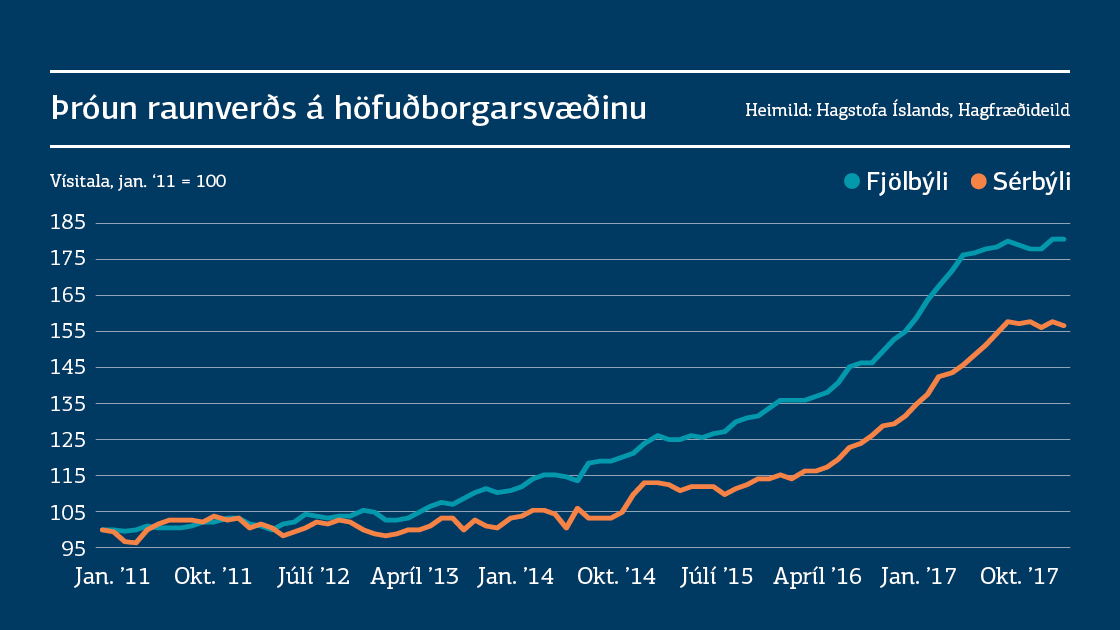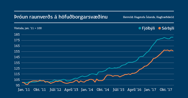 Samkvæmt tölum Þjóðskrár hækkaði fasteignaverð á höfuðborgarsvæðinu um 0,5% í febrúar. Þar af hækkaði verð á fjölbýli um 0,7% en verð á sérbýli lækkaði um 0,3%. Verð á fjölbýli hefur hækkað um 9,8% á síðustu 12 mánuðum og verð á sérbýli um 13%. Heildarhækkun húsnæðisverðs nemur 10,6%. Fasteignaverð á höfuðborgarsvæðinu hafði nú í febrúar hækkað um 1,9% á síðustu sex mánuðum, en hækkaði um 8,5% næstu sex mánuði þar á undan. Verðhækkanir voru litlar seinni hluta 2017 og væntingar hafa staðið til þess að meiri ró verði á þessum markaði á næstu misserum. Þessi niðurstaða fyrir febrúar þarf ekki að raska þeirri spá. Ekki er ólíklegt að verðhækkanir verði meiri en var seinni hluta 2017 og jafnframt mun minni en var í rúmt ár þar á undan.