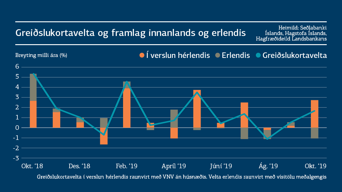 Velta innlendra greiðslukorta jókst um 1,6% að raunvirði milli ára í október. Velta í verslunum hér á landi jókst um 3,5% milli ára miðað við fast verðlag en dróst saman um 4,8% í viðskiptum erlendis miðað við fast gengi. Til samanburðar var vöxturinn 13% erlendis og 3% í verslunum hér á landi í október í fyrra. Verulega hefur hægt á kortaveltu erlendis og vöxtur í október því eingöngu kominn til vegna aukningar í kortaveltu í verslunum innanlands.
