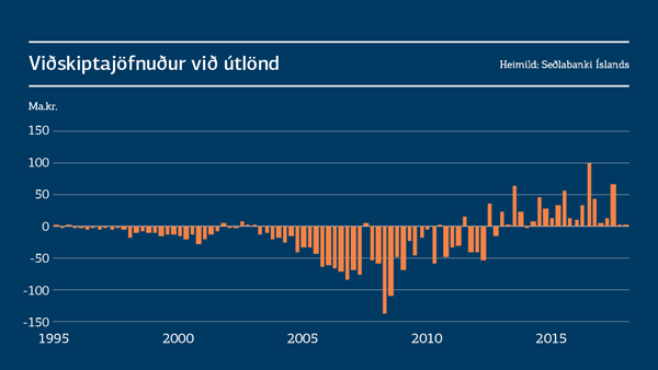 Þetta er 16. fjórðungurinn í röð sem afgangur er á viðskiptajöfnuði við útlönd, en seinast mældist halli á 1. ársfjórðungi ársins 2014. Afgangurinn nú er hins vegar verulega minni en á sama tíma í fyrra þegar hann mældist um 5,6 milljarðar króna.