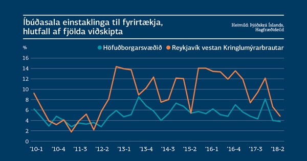 Eftirspurn fyrirtækja, væntanlega fyrst og fremst leigufélaga, eftir íbúðum virðist hafa minnkað töluvert á höfuðborgarsvæðinu það sem af er þessu ári. Sala einstaklinga til fyrirtækja var um 6% á árunum 2015-2017, en var komin niður í 4% á fyrri hluta ársins 2018. Þessar tölur eru vísbending um að eftirspurn leigufélaga eftir íbúðum hafi minnkað og að sama skapi má væntanlega segja að kaup byggingarverktaka á íbúðum til breytinga og niðurrifs hafi minnkað. Minnkunin milli ára er sérstaklega mikil fyrir miðsvæði Reykjavíkur. Þar var sala einstaklinga til fyrirtækja á bilinu 10-13% á árunum 2015-2017 en var komin niður í 6% á fyrri hluta þessa árs. Það virðist því sem ástandið á því svæði sé tekið að róast meira en annars staðar á svæðinu hvað viðskipti af þessu tagi áhrærir.