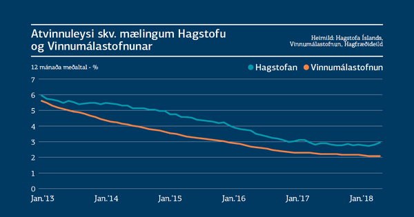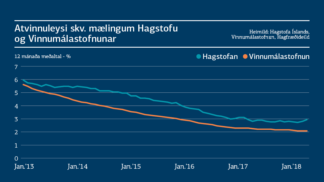 Atvinnuleysi minnkaði stöðugt fram á mitt síðasta ár, en síðan hefur dregið verulega úr breytingum. Meðalatvinnuleysi síðustu 12 mánaða miðað við mælingar Hagstofunnar var 2,9% í apríl og hefur sú tala verið nær óbreytt í eitt ár. Meðalatvinnuleysi síðustu 12 mánaða samkvæmt tölum Vinnumálastofnunar um skráð atvinnuleysi var 2,1% nú í apríl, en 2,2% í apríl í fyrra.